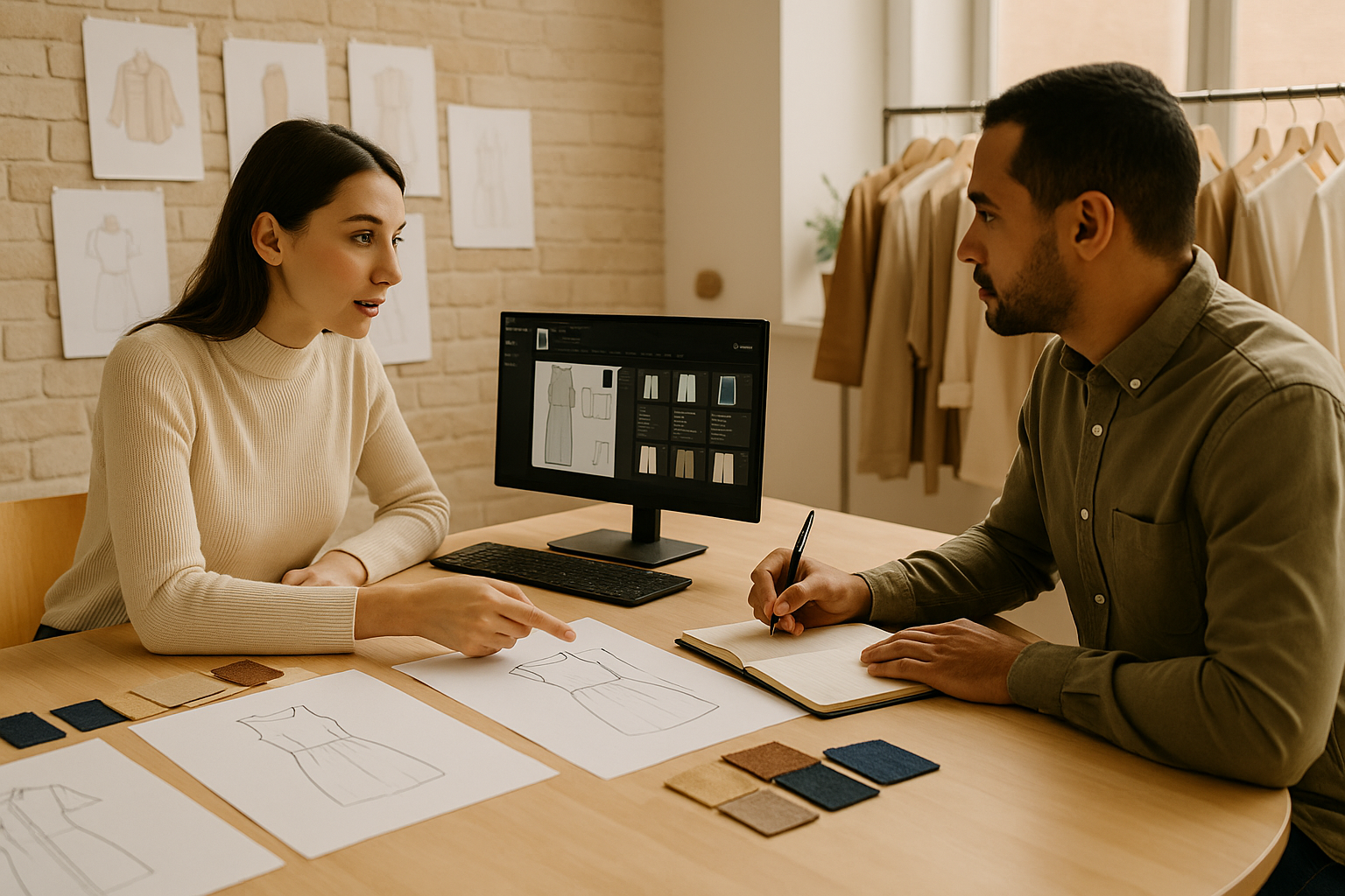 Fashion designers collaborating on garment tech packs using Tailr’s platform, ensuring accuracy and efficiency in fashion production.